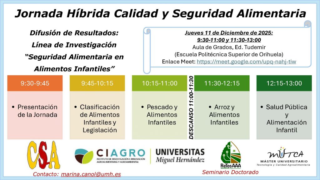 El jueves 11 de diciembre, de 9:30 a 13:00 h, en el salón de grados del edificio Tudemir (también online https://meet.google.com/upq-nahj-tiw) tendrá lugar la Jornada Híbrida Calidad y Seguridad Alimentaria en la que se hará una difusión de resultados de la línea de investigación «Seguridad Alimentaria en Alimentos Infantiles». Estará impartida por Esther Sendra Nadal, Antonio José Signes Pastor, Marina Cano Lamadrid, Ana Micaela Solivella y Marcos Rodríguez Estrada.
