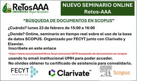 El próximo lunes 23 de febrero, de 15:00 a 16:00 h tendrá lugar un seminario online sobre cómo utilizar la base de datos de Scopus. Está organizaco por FECYT y con el apoyo de Clarivate y Elsevier.
